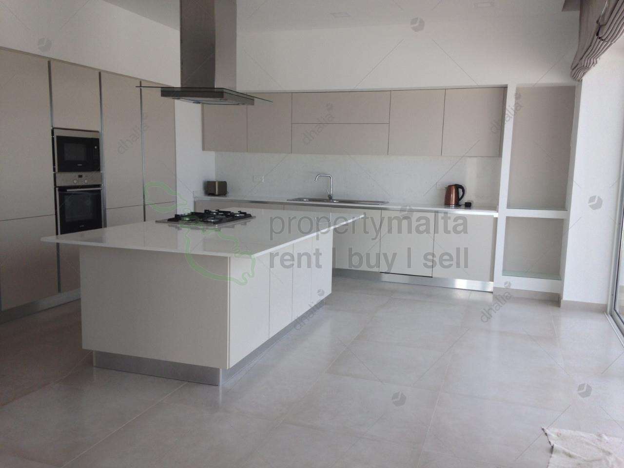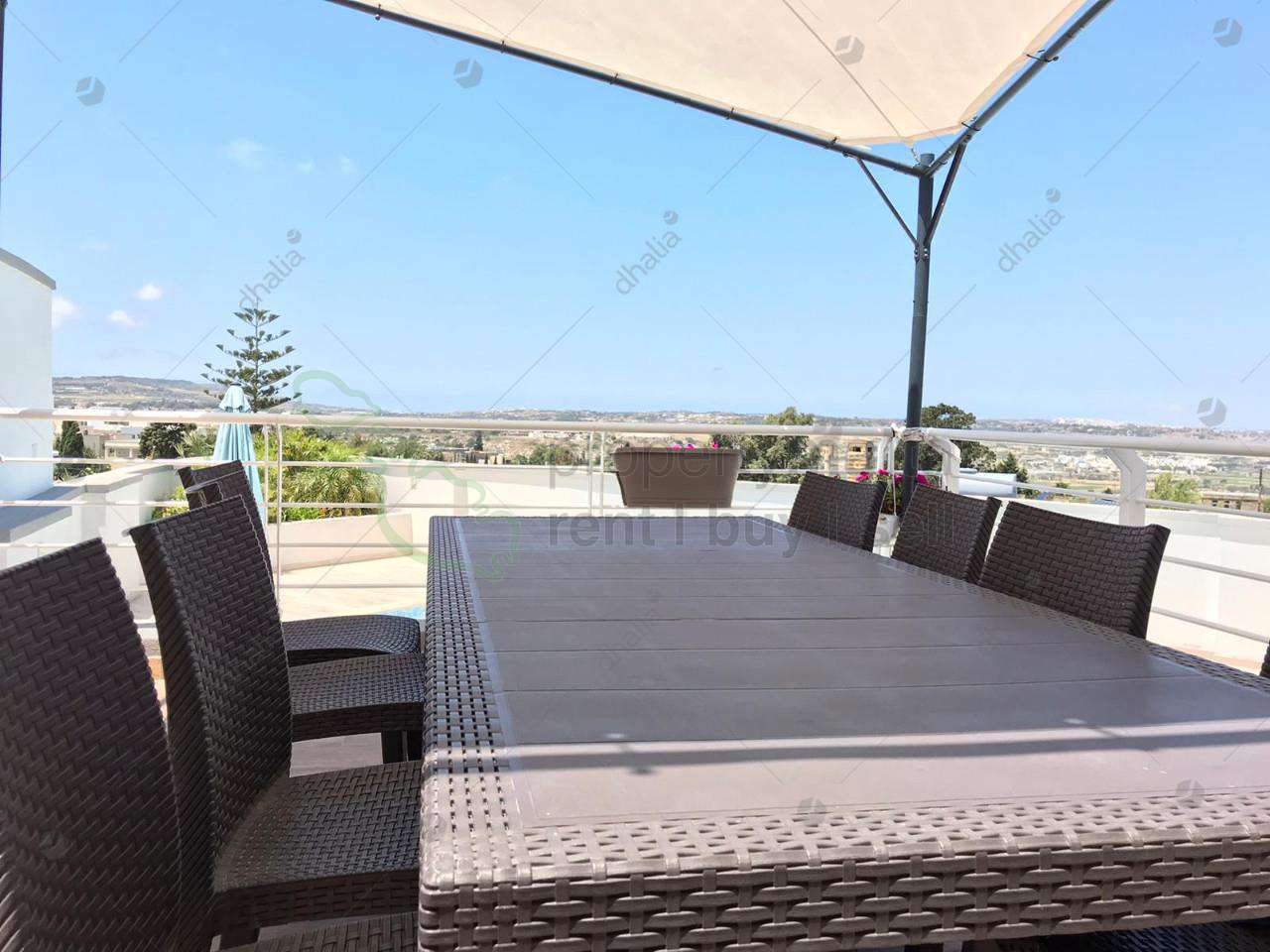 Street-level semi-detached bungalow plot measuring 750 square metres, fully equipped and finished to the highest of standards in 2017. This property is set on two levels, living quarters at street level set on an open-plan layout comprising a beautiful kitchen with a large island and combined separate dining room, large living room, storage room, a study and guest toilet. Interconnecting two-car garage and large driveway. All rooms have wide apertures and enjoy plenty of natural light and country and distant sea views throughout. Kitchen/living and dining rooms lead onto two sizeable west-facing terraces with views that enjoy sunsets all year round. The lower level comprises four bedrooms all with ensuite bathrooms and three of these bedrooms have walk-in wardrobes, a large laundry room and a storage room. The beautiful pool area has ample deck space, large pool with jacuzzi, lovely side garden and pool shower. This property is fitted with double-glazing apertures throughout, intercom and CCTV; alarm system; Siemens solar water heater installed on the roof.