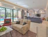 ample natural light. The modern kitchen is fitted with top-of-the-range appliances and has a large pantry attached. The house features an extensive outdoor area including a private garden with a heated pool, internal