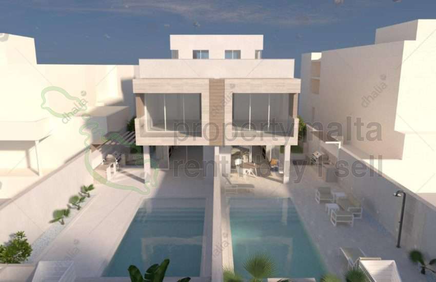 Madliena, a semi-detached villa currently under construction and offered in shell form. The ground-floor level is in the form of a welcoming hall leading to a 127 square metre open-plan kitchen/living/dining area, and a guest bathroom. The pool area spans over 273 square metres. The first floor level hosts three double bedrooms, all with an en-suite facility, whilst on the roof level is a washroom which leads to the roof terrace. A full basement garage complements this property, which has ample space for parking, a games room with a lounge area, storage space and a bathroom. The property also benefits from a lift from the basement level.