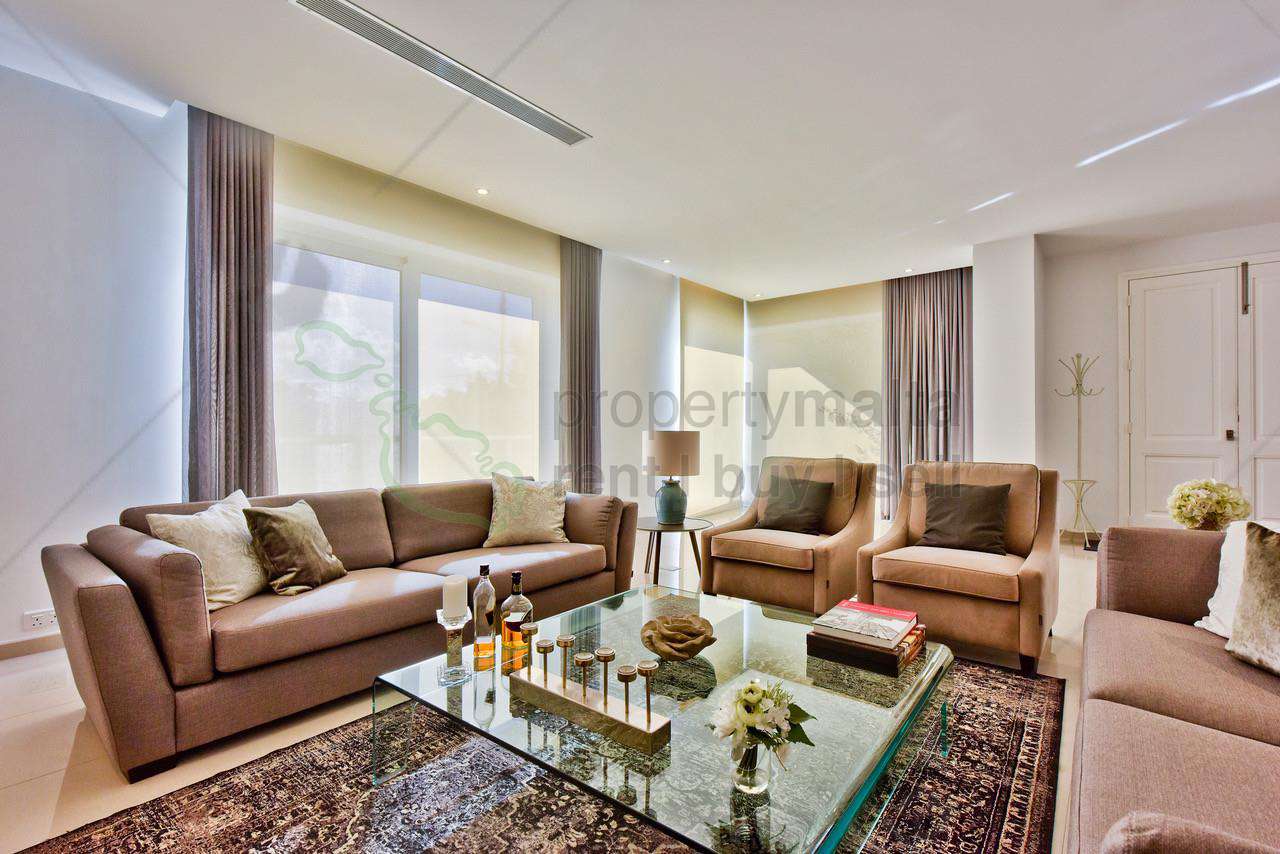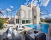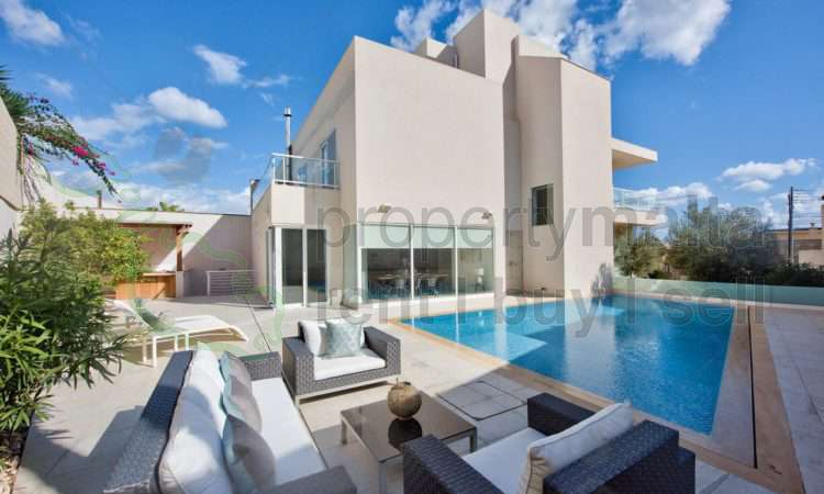 A beautiful new superior villa, which just came on the market. This property has been finished to remarkable detail and is situated in one of the finest residential area’s enjoying distant sea views. Accommodation comprises a hall with cloakroom/guest toilet, formal sitting room with a fireplace and an open plan highly equipped kitchen/living/dining area leading to a spacious garden and a lovely pool area with its own kitchen. Upstairs having three bedrooms, one with ensuite bathroom and the main bathroom. All bedrooms have spacious terraces. On the top floor, you could either have a study or an extra bedroom with a large terrace. The basement level has a games room, two more bedrooms, one having an ensuite bathroom, a shower room for the pool, laundry and garage with space for four cars. The property is fully air-conditioned and is complemented by a lift from basement level to top floor.