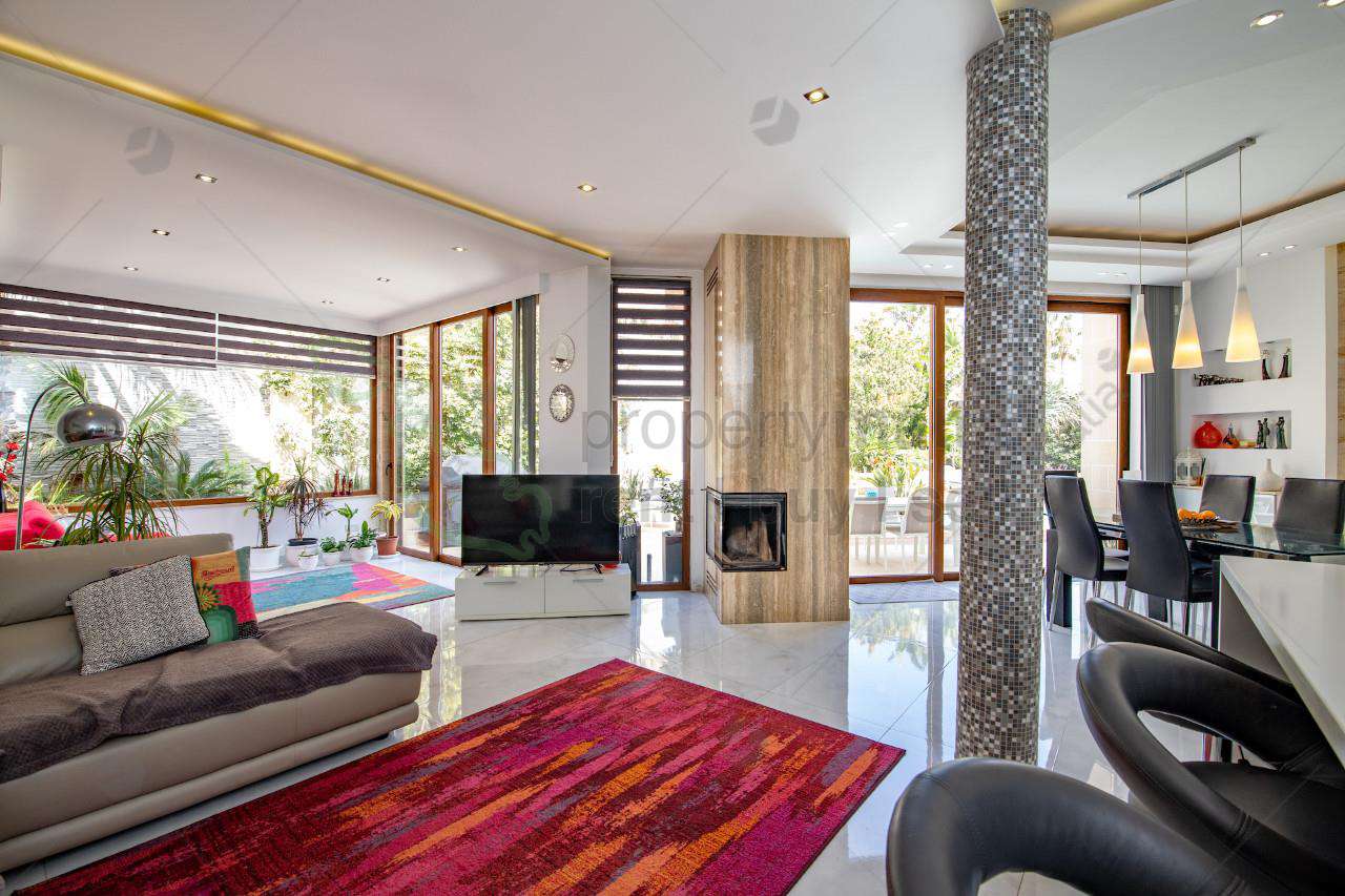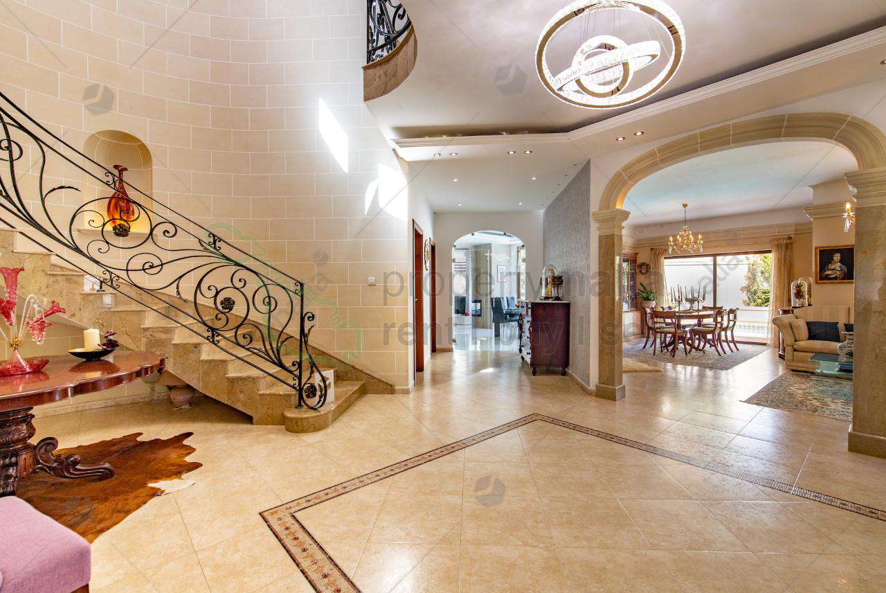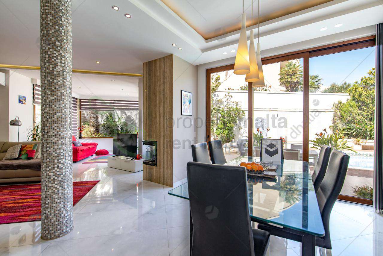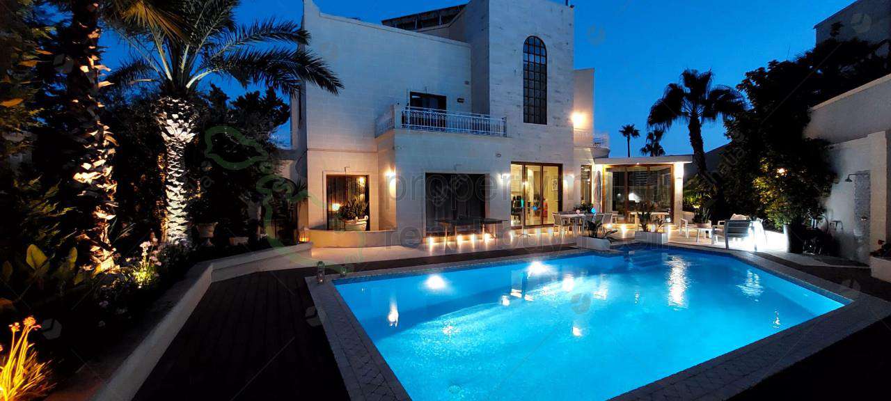 Victoria Gardens – A rare opportunity to acquire a wide-fronted semi-detached villa in this exclusive and tranquil area. The property welcomes you with a grand entrance hall leading to a study, ideal as a home office or easily convertible into a fourth bedroom, along with a guest bathroom for added convenience. Further inside is an open-plan layout that overlooks a sprawling 280-square-metre pool area, featuring a fully fitted kitchen, a spacious dining and living area, and a separate formal sitting and dining room. Upstairs are three generously sized double bedrooms all enjoying access to a terrace, with the master bedroom also benefiting from an en suite. At the roof level, a washroom enjoys distant sea views, while the basement level features a spacious five-car garage. Additionally, a self-contained flatlet, complete with a kitchenette, bathroom, and cinema room, with direct access to the pool area. This exceptional home must be seen to be truly appreciated.