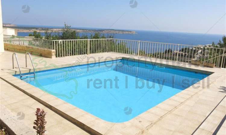 Fully detached furnished three-bedroom bungalow in Mellieha enjoying breathtaking views from all rooms. Accommodation comprises an entrance hall, kitchen/ dining/ living, kitchen/ breakfast area, three bedrooms, private swimming pool/ BBQ area, large garden with fruit trees, and a one-car lock-up garage. Property is fully equipped .